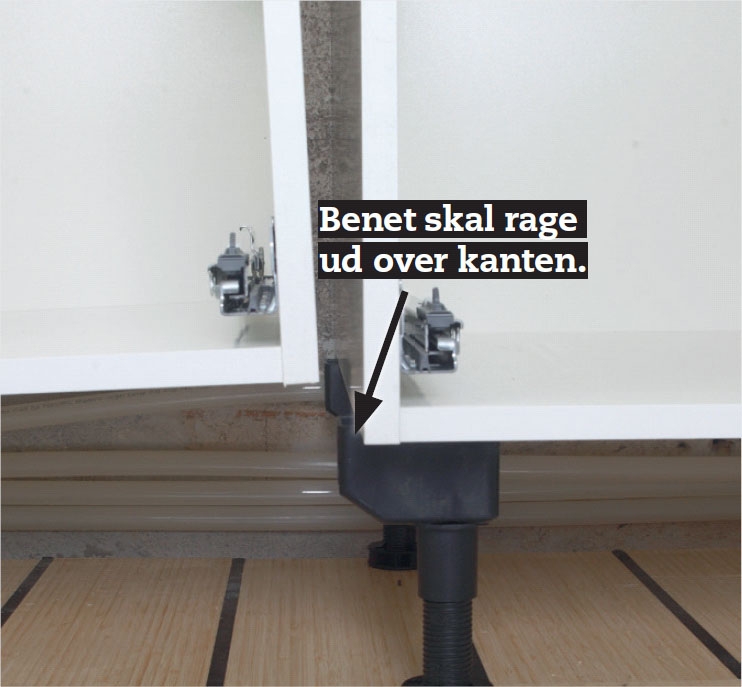 Nu skal der ben på. Her er huller i bunden af skabene til det samme, så det er blot at banke dem i og skrue dem fast. Udformningen kan variere lidt på de forskellige køkkenfabrikater.