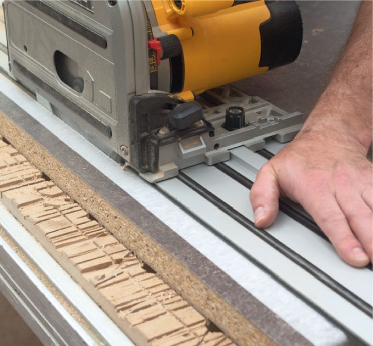 Sav pladen til. En rundsav er det eneste rigtige her, da den laver fuldstændig lige snit. Brug en føringsskinne, hvis du har en, ellers spænd et lige bræt på til at save efter.