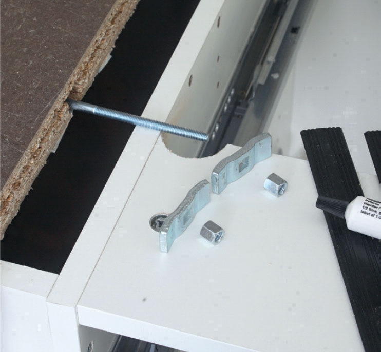 Spænd samlebeslagene godt til. De er udformet, så de trækker skabssiderne tæt sammen og låser dem i den position. Skal du en dag skille skabet ad, skal beslagene blot drejes modsat.