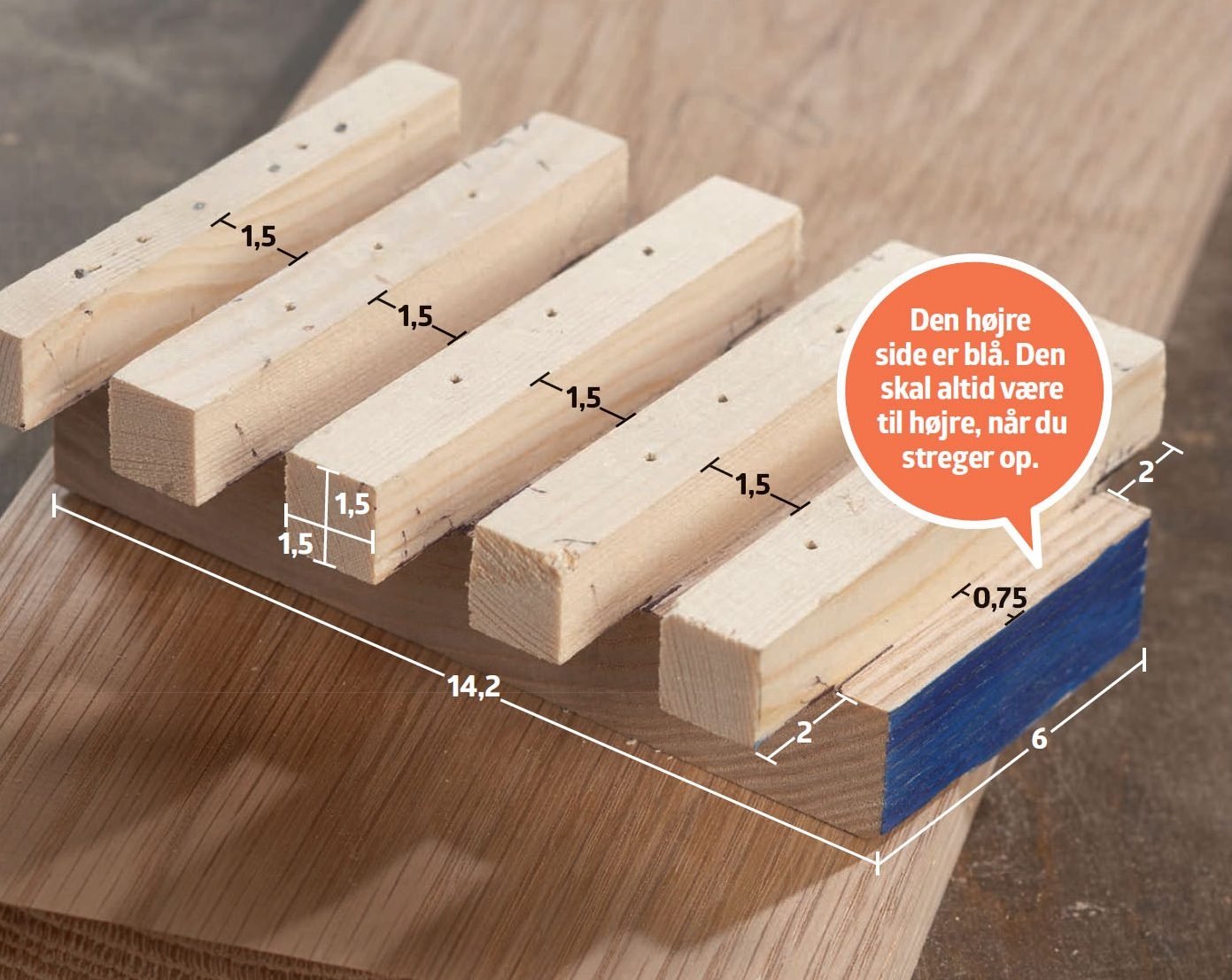 Skabelonen består af et stykke træ på 15 x 14,2 cm med en bredde på 6 cm. Mål 7,5 mm fra “den blå side”, og placér et stykke 15 x 15-mm-liste, der stikker 2 cm ud i begge sider. Placér 15 x 15-mm-lister parallelt med 1,5 cm’s afstand på resten af skabelonen.