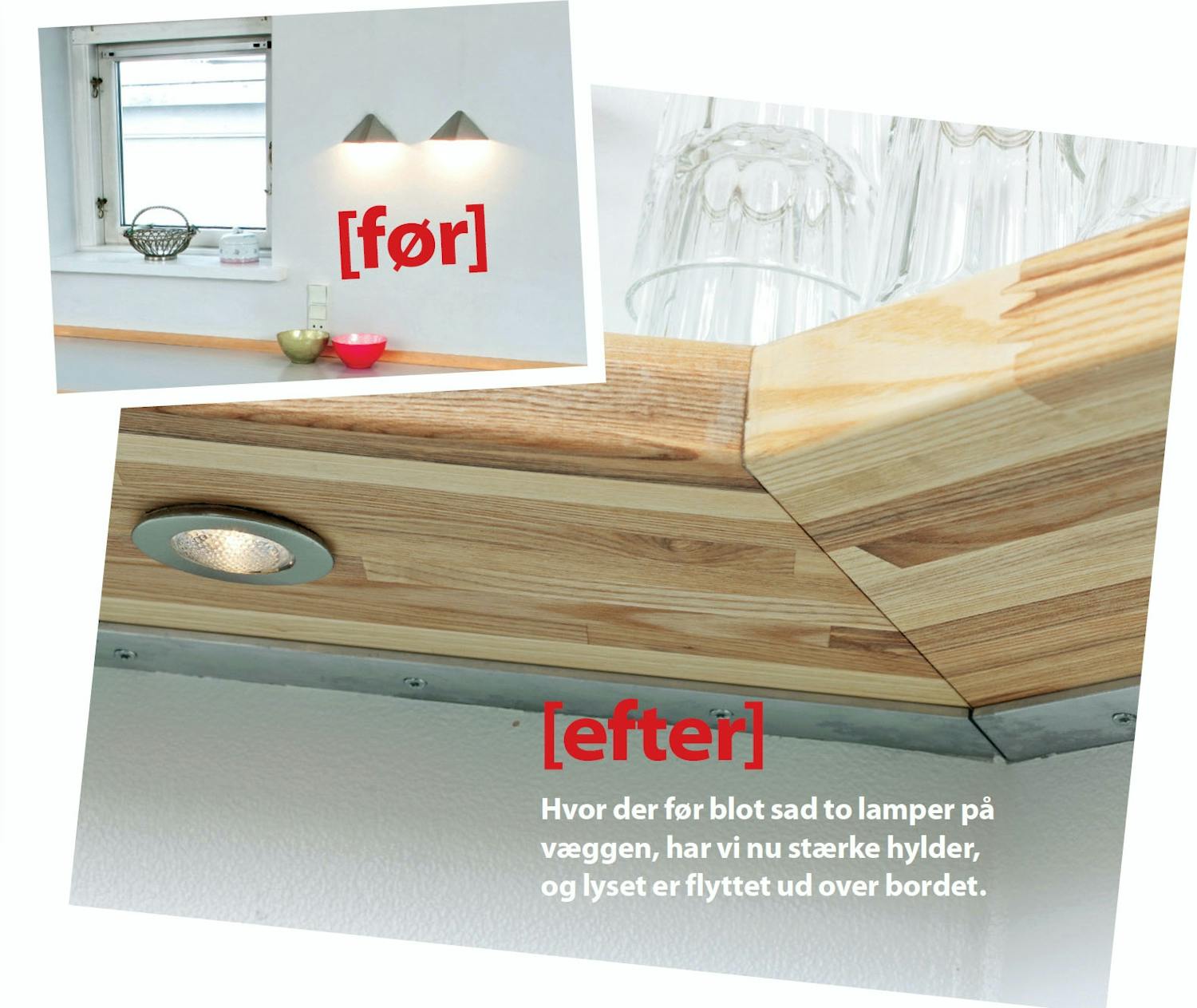 Så let slipper vi ikke, for på undersiden af hylderne vil vi have en stribe halogenspot til at lyse ned på bordet. Den enkle løsning er at sætte dem uden på hylden, men vi har givet os selv den udfordring at bruge spot, der sænkes op i hylden, og at trække kablerne skjult.