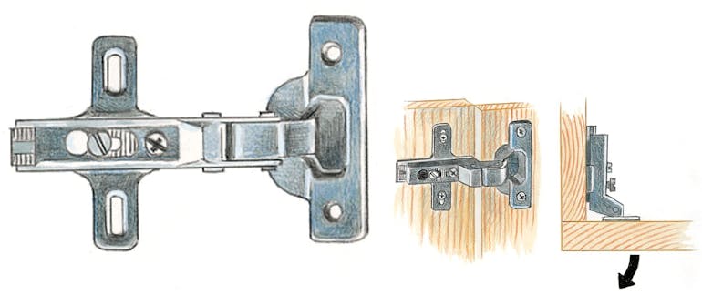 Hængslet har mange justeringsmuligheder, men monteringen kræver til gengæld en del præcision. Hængslet er skjult inde i skabet, men lågen ligger normalt udenpå.