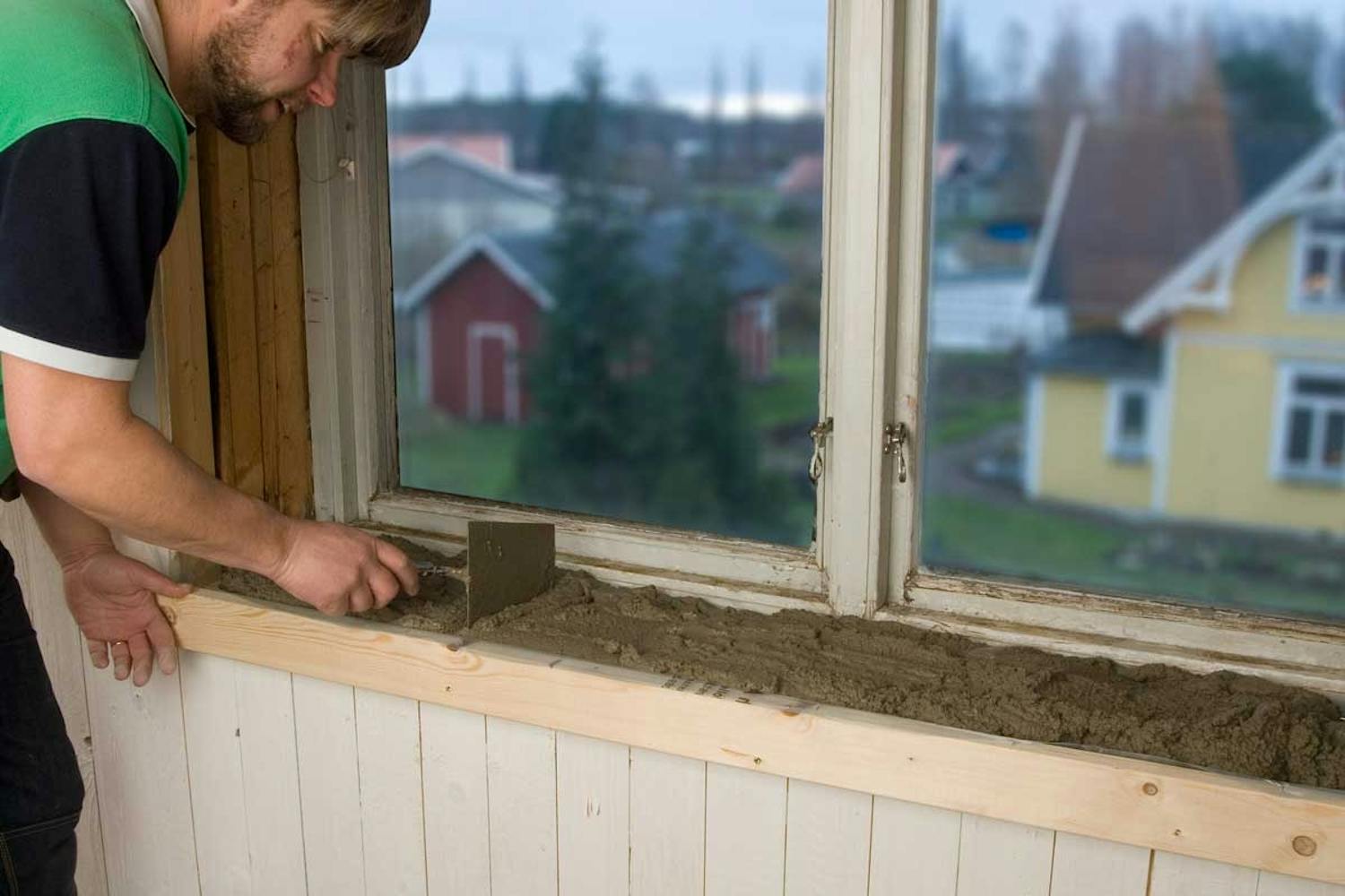 Her støber vi en enkel betonplade, som flugter med væggen. Hvis du vil have en vindueskarm, som rager lidt ud fra væggen, skal du bygge en form af tre brædder, som du sømmer sammen, inden du skruer den fast på væggen.
