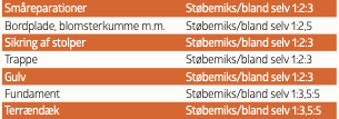 Beton blandes af cement, sand og sten, og blandingsfor- holdet opgives i den rækkefølge. 1:2:3 betyder derfor 1 del cement, 2 dele sand og 3 dele sten. Stenene varierer i stør- relse efter betonlagets tykkelse. En tommelfingerregel siger, at de ikke må være tykkere end 1/3 af det færdige betonlag. Til opgaver, der kræver en pæn, glat overflade, fx havefliser, bruges ikke sten. Så hvis der kun er to tal, fx 1:3, betyder det, at der ikke skal tilsættes sten.
