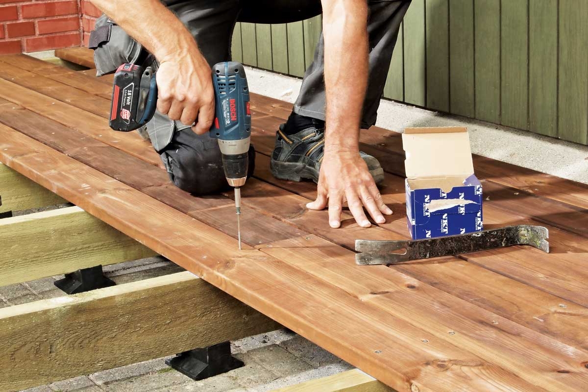 Kilerne lægges ind under terrassens strøer. Et vaterpas på tværs af strøerne sikrer, at de ender i eksakt samme niveau.