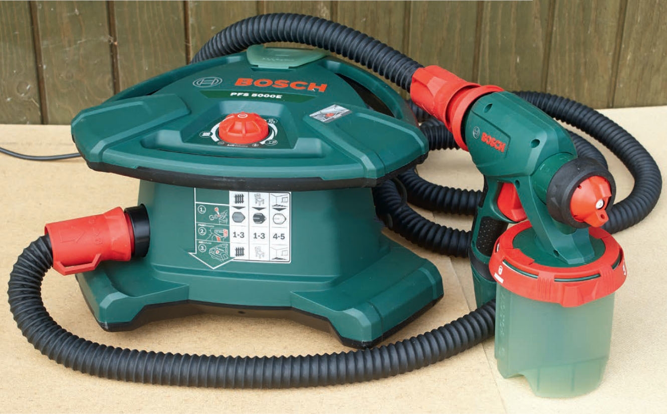 En moderne sprøjtepistol virker ved stort set samme luftmængde som tidligere, men med et langt lavere tryk. Sprøjten kan være med en separat luftenhed som her. Mindre modeller vil ofte have luftenheden siddende på selve pistolen.