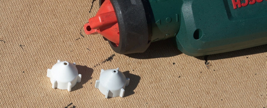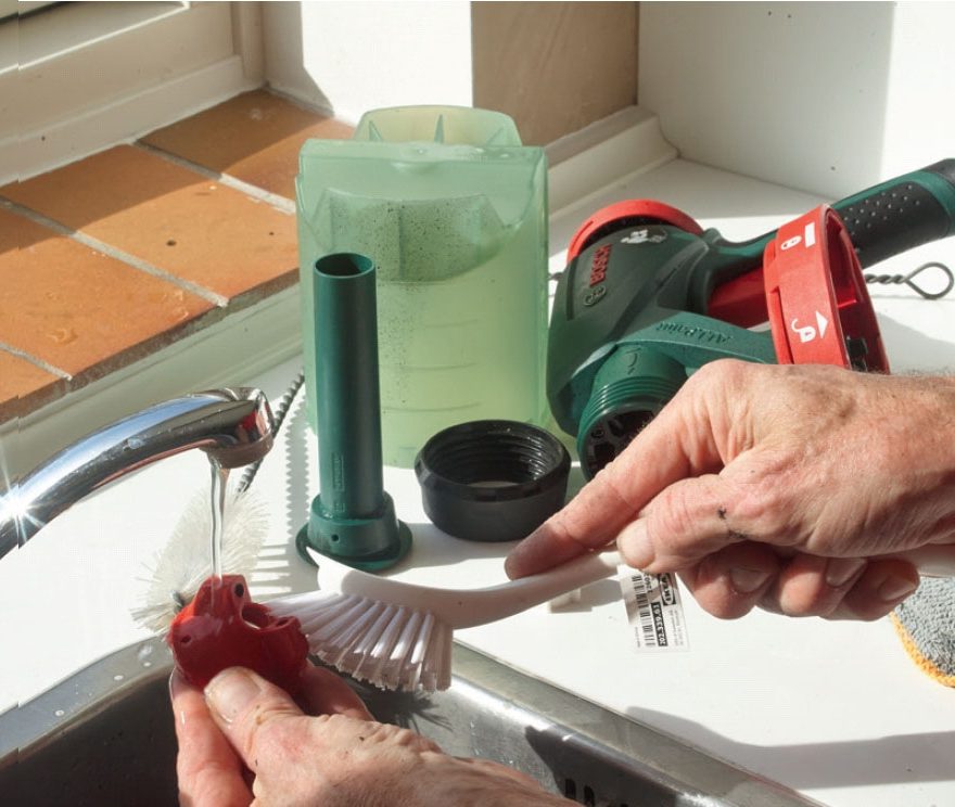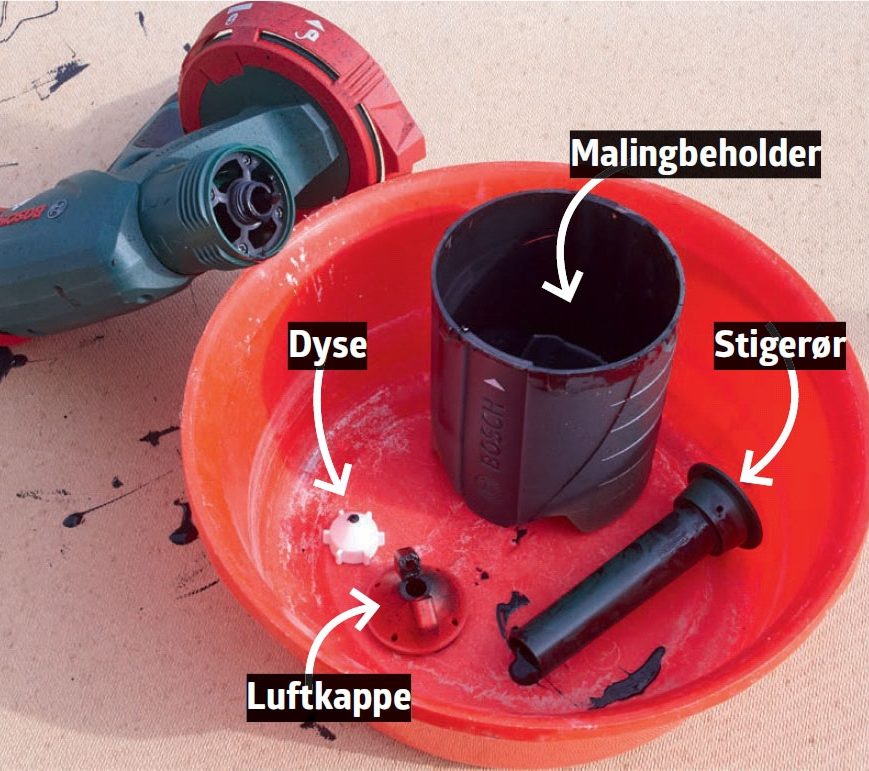 Lavtrykssprøjten er enkel i sin opbygning og let at skille ad. Skru omløberen (den del, der holder dysen på plads) af, og tag luftkappe og dyse ud. Skru beholderen af, og træk stigerøret ud. Så er du klar.