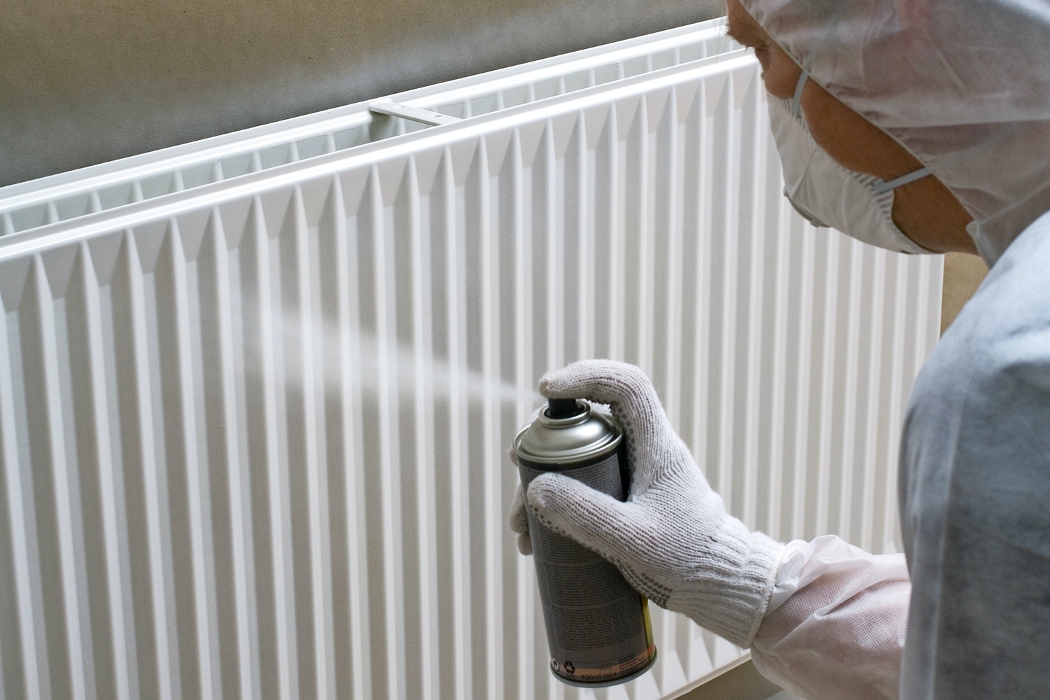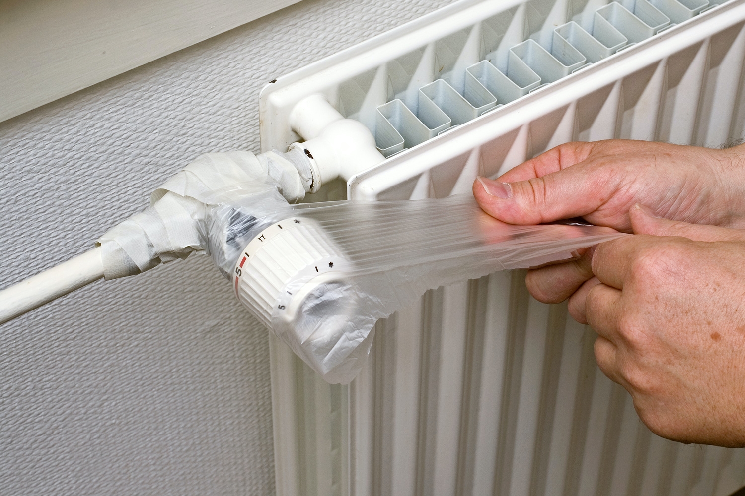 Spraymaling kommer ind ad selv de mindste sprækker, så spraymaler man indendørs, er det vigtigt at afdække effektivt. Det mest oplagte er naturligvis de ting, der er i umiddelbar nærhed af emnet, der skal males, som fx termostat og rør på radiatoren (som vist her til højre). Men også vægge og gulve i rummet skal dækkes af.