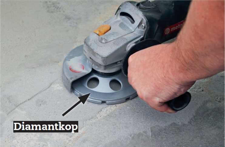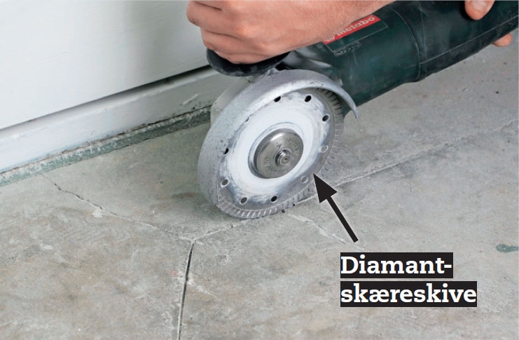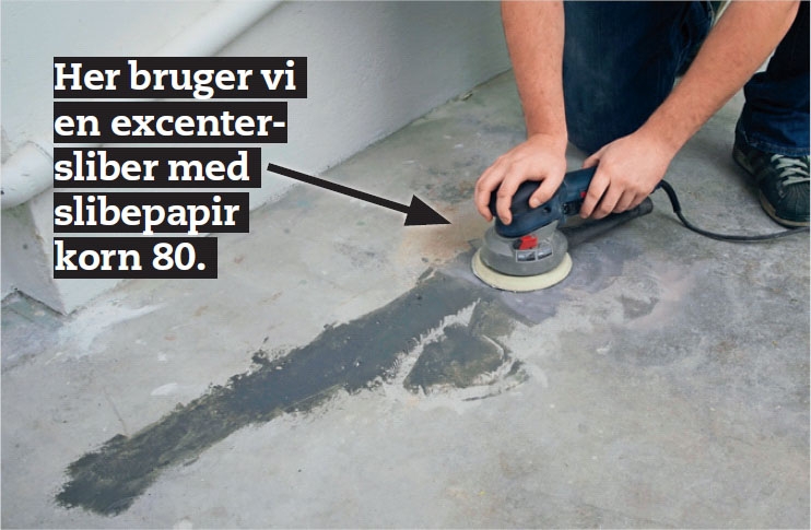 Forhøjninger på gulvet slibes, indtil gulvet er helt plant. Brug en vinkelsliber med en diamantkop på. Skru ned for hastigheden - så er det lettere at styre.