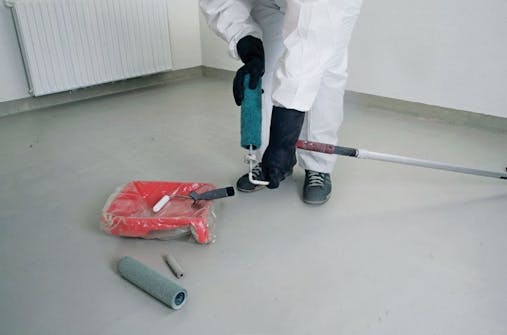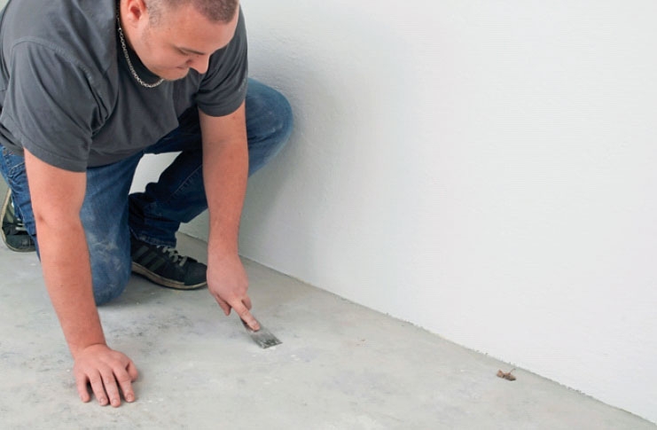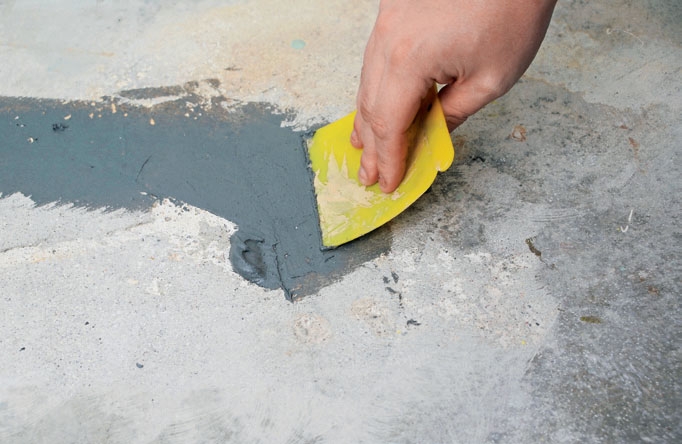 Inden du kan male, skal gulvet renses. Er der revner, buler eller små huller, skal de repareres. Små revner og huller kan lappes med kemisk metal, der kan trækkes i helt tynde lag uden at skalle af - i modsætning til en cementbaseret reparationsbeton, som er nødvendig, hvis der er større huller i gulvet.
