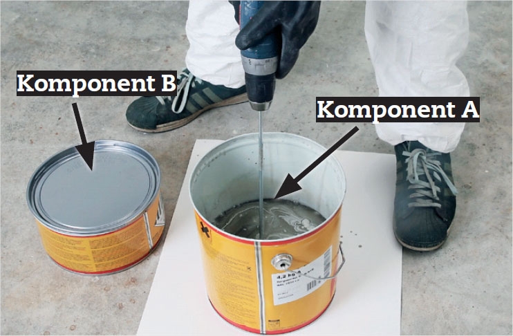 Før du blander de to komponenter, skal den harpiks holdige maling (komponent A) røres godt igennem. Brug en blandespiral (et piskeris) på en langsomtkørende boremaskine.