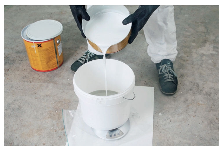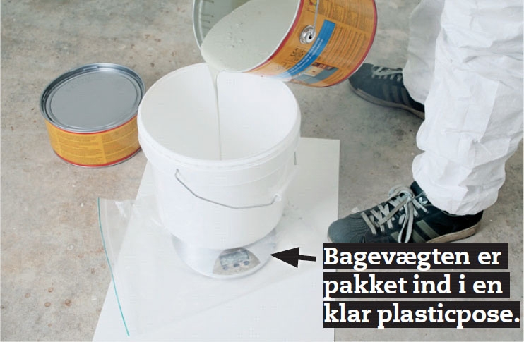 Sæt en ren malerspand på vægten, og nulstil vægtens skala. Hæld den ønskede mængde af komponent A i. I vores tilfælde er det halvdelen (2,1 kilo).