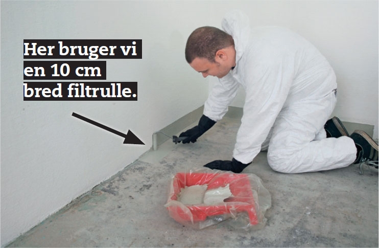 Gulvet males med en rulle på et skaft. Det er en fordel at male et lille stykke op på væggen. Den lille kant er praktisk, når gulvet skal vaskes, og så giver det en pæn panellignende afslutning.