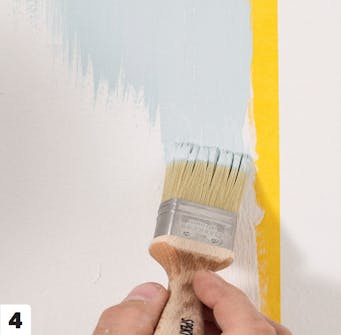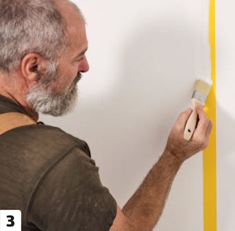 Mal med hvid maling på tapen. Kanten af tapen skal lukkes med hvid maling ind mod det felt, der skal males i en farve. Det forhindrer den farvede maling i at løbe ind under tapen.