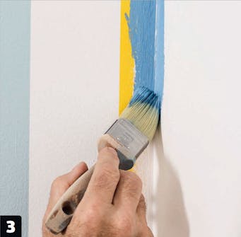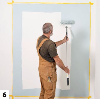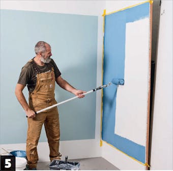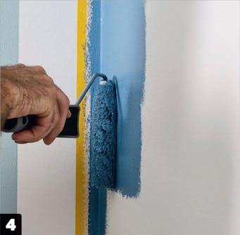Fyld det farvede felt ud. Mal med en stor malerrulle, og husk at arbejde “vådt i vådt”, så du ikke ruller over allerede tør maling og danner striber.