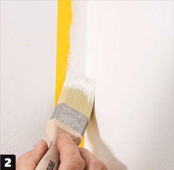 Mal med hvid maling på tapen. Tapen er sat på den tilstødende væg, så der kan males helt til kant.