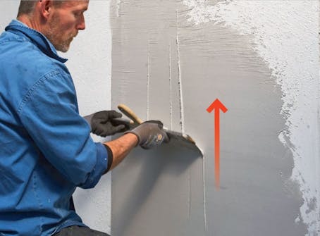 Put multipuds på et stålbræt, og træk pudsen på væggen. Den trækkes på i én omgang - nedefra og opefter i lodrette baner, mens du trykker stålbrættet hårdt mod væggen. Når pudsen har sat sig efter 15-30 min., glattes overgangen mellem banerne ud med et stålbræt. Lad pudsen tørre lidt op, ca. 15 min.