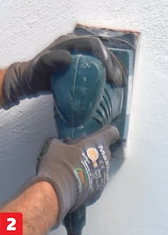 Slib væggen med rystepudser med groft slibepapir, korn 40. Bevæg maskinen med cirkelbevægelser. Her er underlaget en gipsvæg, så der skal ikke trykkes for hårdt, da det kan ødelægge underlaget. Skal du slibe flere vægge, kan du leje en såkaldt girafsliber, der har en større rækkevidde.