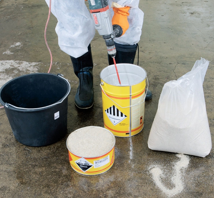 Når grunderen har tørret i 12 timer, skal epoxymalingen på. For at drøje og forstærke malingen blander vi den op med kvartssand. Da sandet bundfælder sig hurtigt, er det nødvendigt at røre i blandingen, umiddelbart før du hælder en portion ud på gulvet.