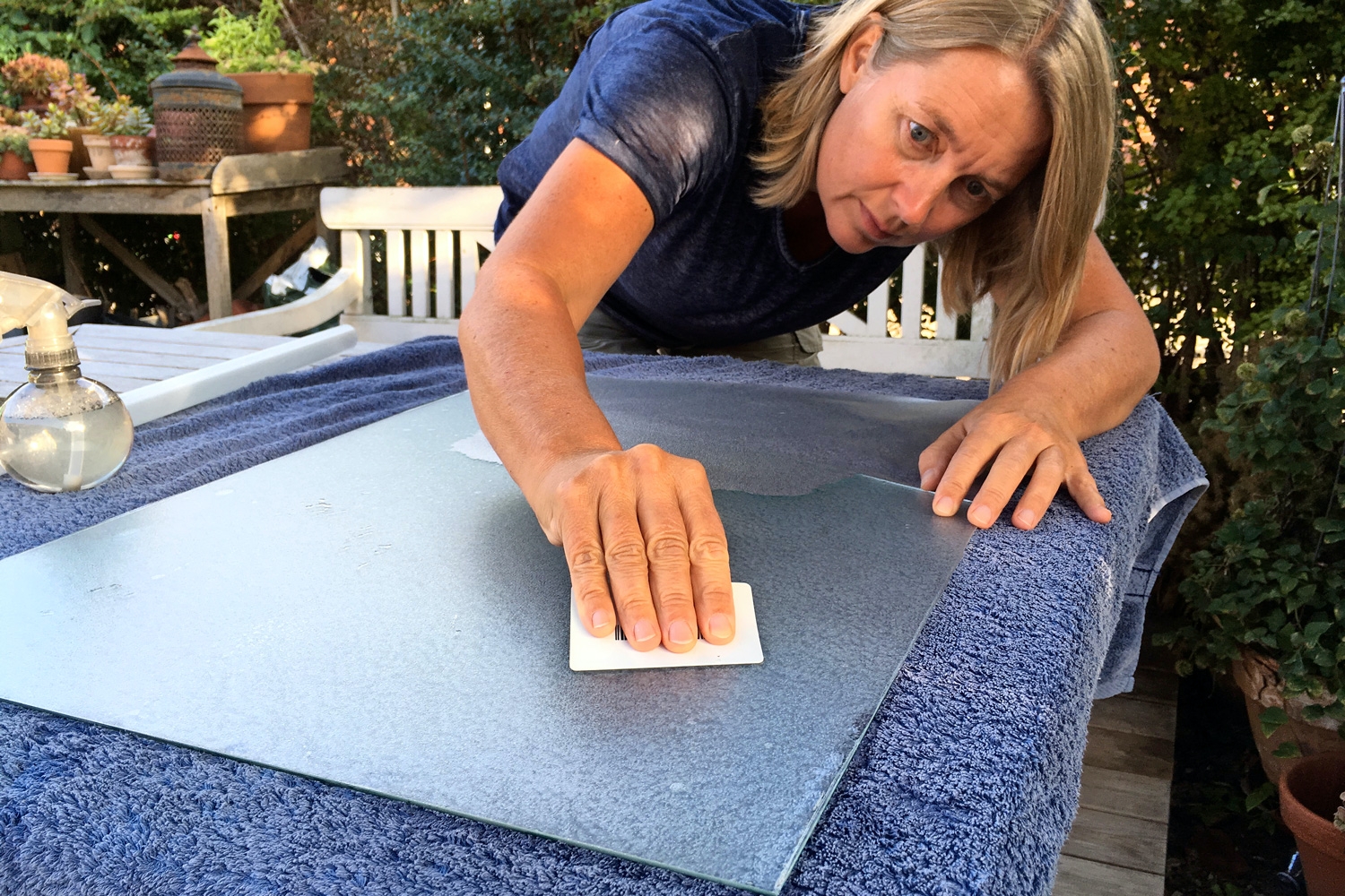 Der sprøjtes lidt sulfovand på glasset med en vandforstøver, før folien lægges på. Det er vigtigt, folien lægges præcist fra starten, for den kan ikke finjusteres, når først hele stykket er lagt. Så skal du starte forfra.