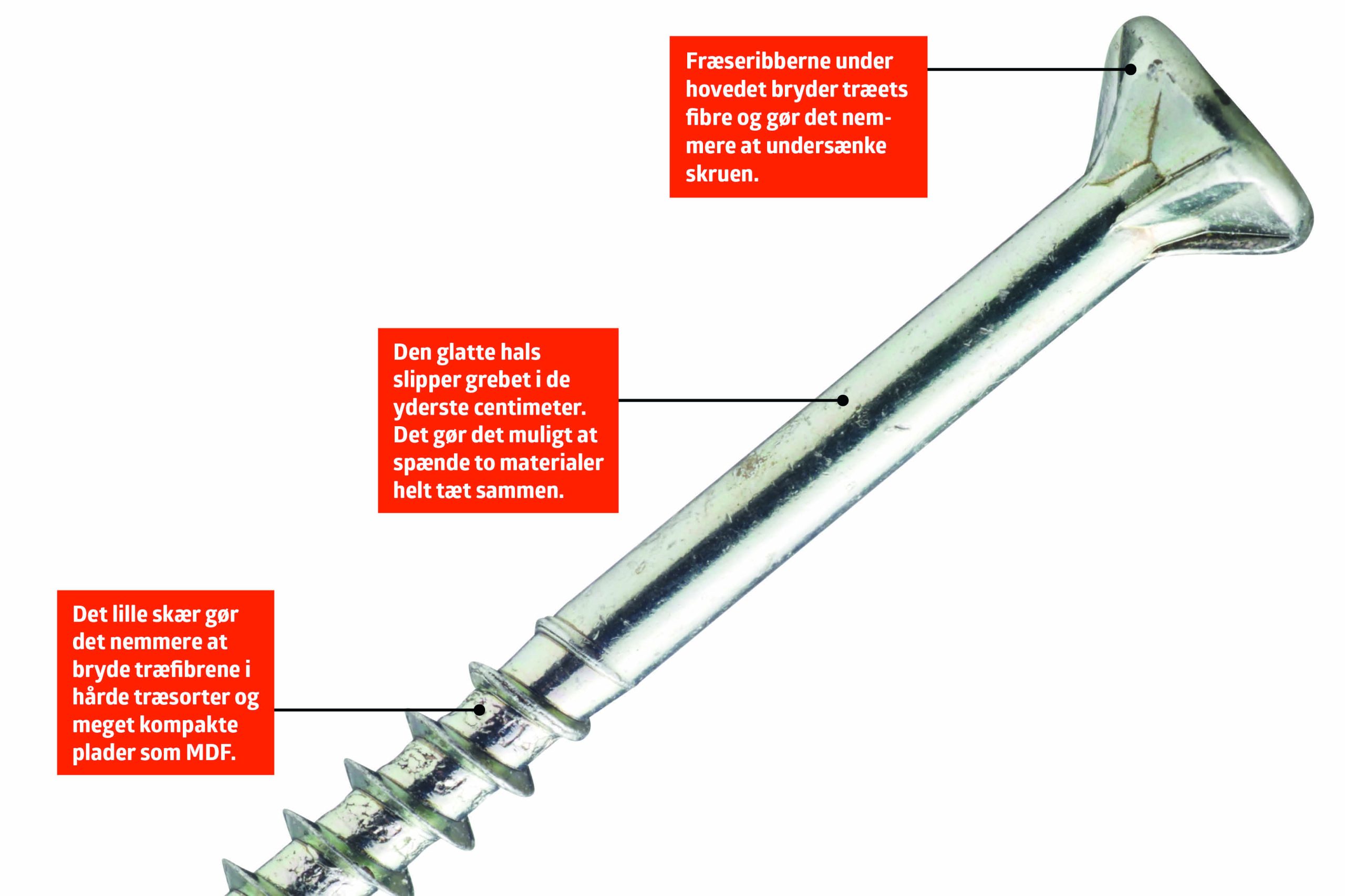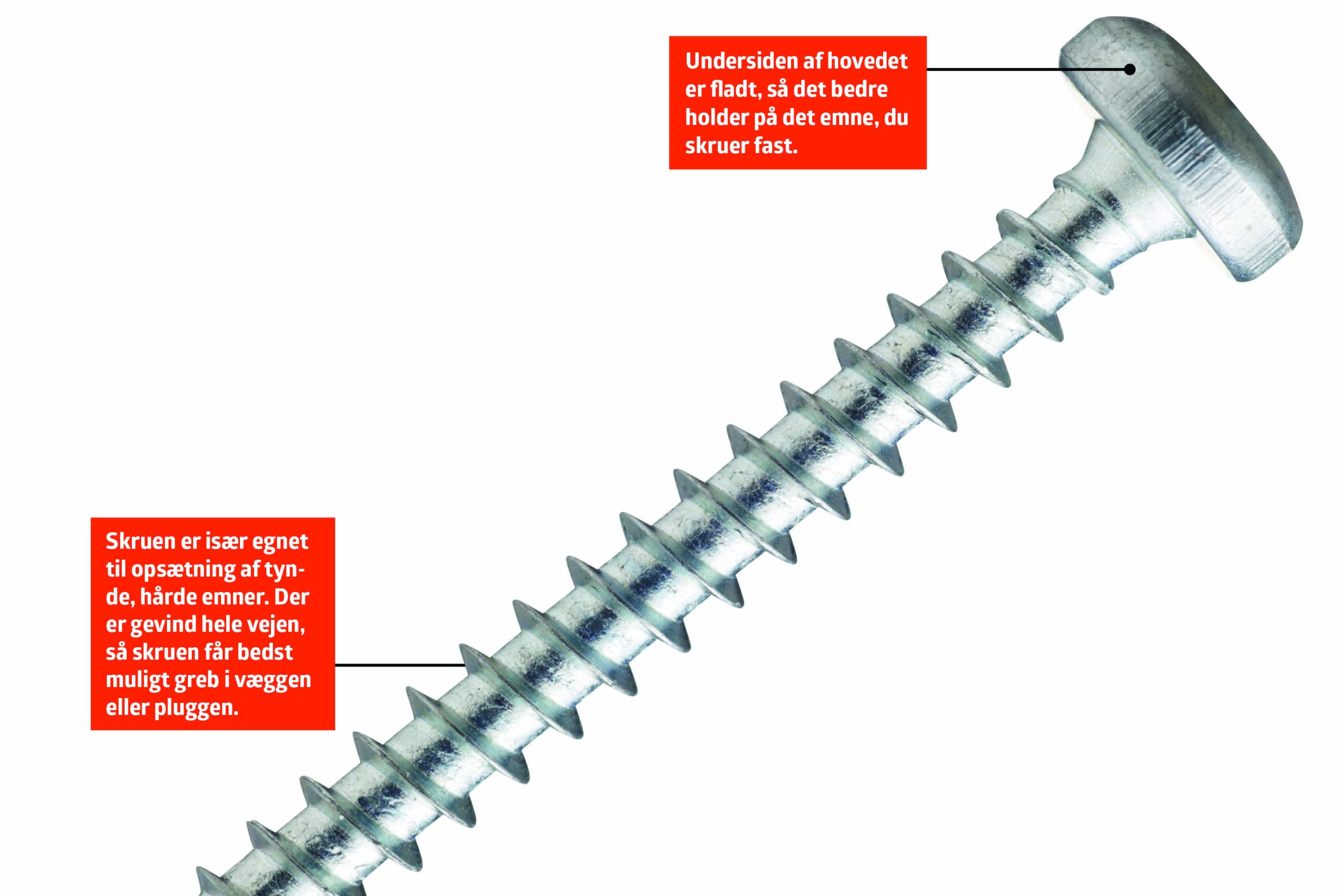 Skruen er genial, og det er den klart mest alsidige skrue i samlingen. Derfor har vi den også altid på lager i tre størrelser. Med dem kan vi klare omkring 90 % af alle de skrueopgaver, vi kommer ud for i og omkring hjemmet.
