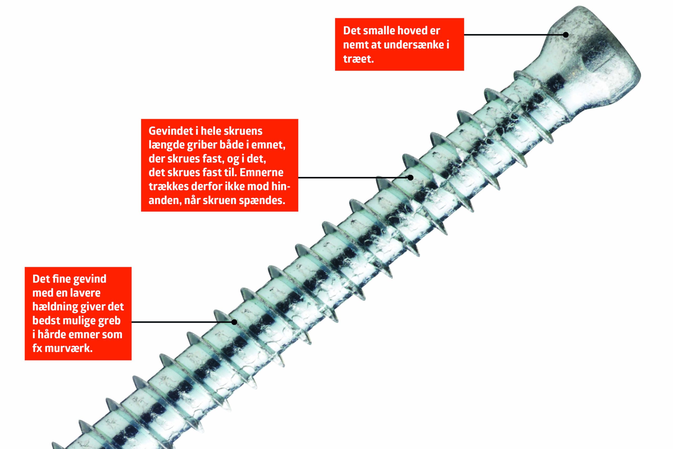 Skruen findes både i en model med og en model uden hoved. Vi foretrækker den uden hoved. Gevindet griber nemlig både i emnet, der skrues fast, og i det, du skruer det fast til. Der er derfor ikke behov for et stort hoved til at holde det hele på plads. Samtidig er det nemmere at undersænke skruen uden hoved.