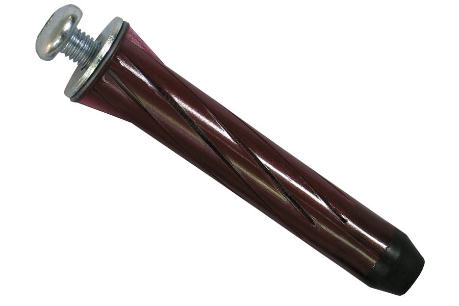 En plug, som kan anvendes i alle materialer. Når skruen skrues i, udvider pluggen sig, og er der et hulrum, danner den en knude.