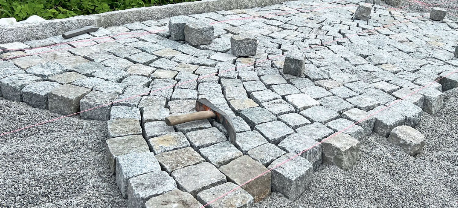 Du grovtilpasser løbende mængden af sættegrus for at udligne de små forskelle i stenenes højde.