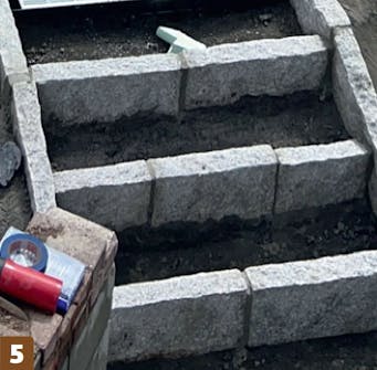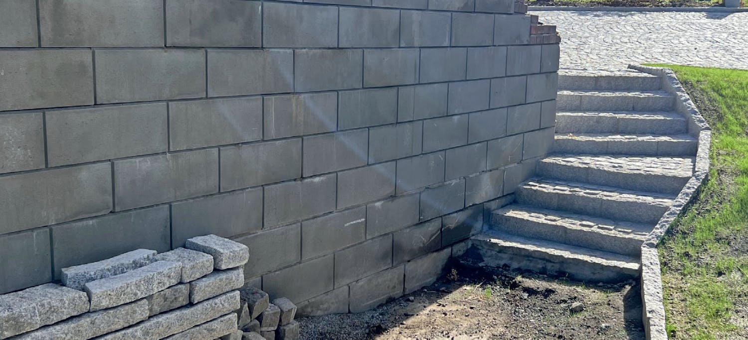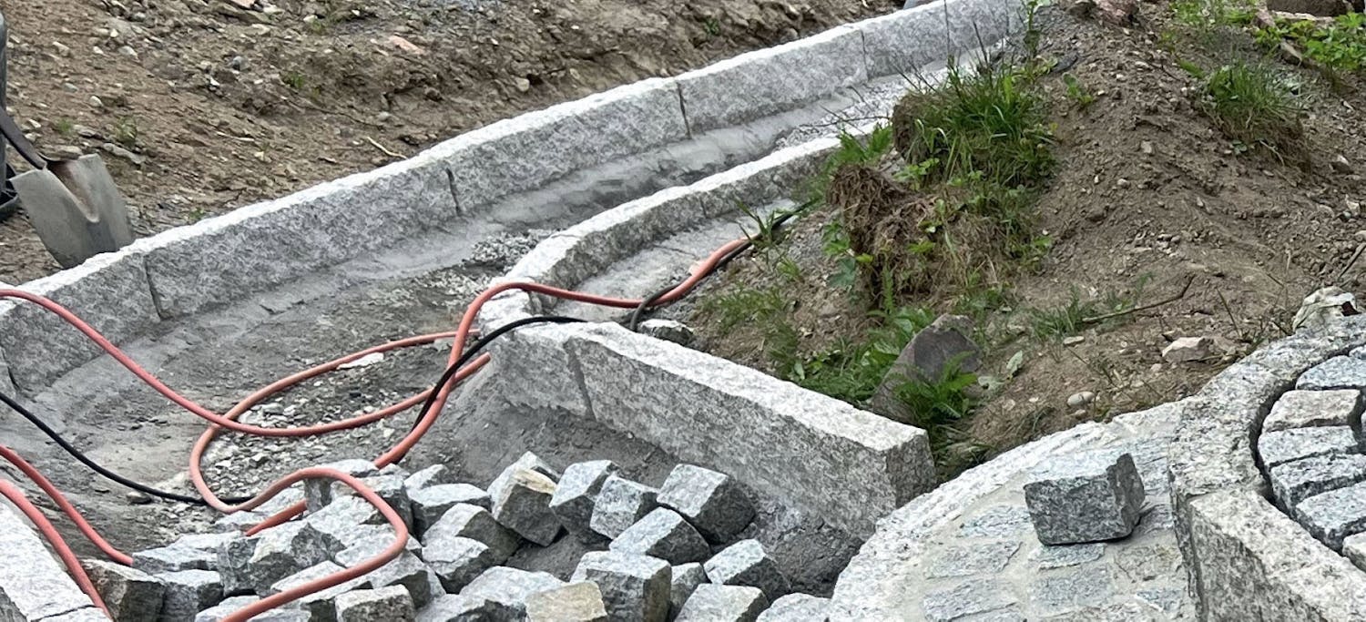 Trappens kantsten bliver placeret i beton. Hele trappens ramme er dermed på plads, og vi er klar til at afslutte trinnene med brosten.