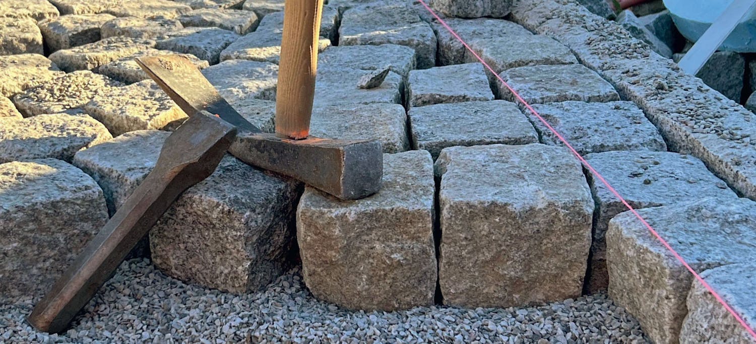 Brostenene tilpasses med en vinkelsliber. Med diamantklinge på maskinen kan du skære riller. Derefter er det relativt let at flække granitten med et endejern.