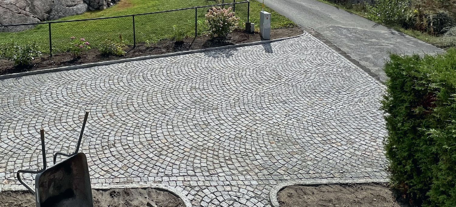 Kantsikringen er nødvendig for et langtidsholdbart resultat. Kantstenen bliver støbt solidt ned i jorden, så den holder belægningen på plads. Ellers vil stenene med tiden skride ud til siderne.