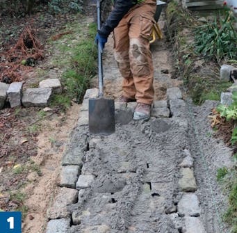 Bland jordfugtig beton af støbemiks og cement. Brug gerne en blandemaskine. Det er vigtigt, at betonen er så stiv, at kantstenene kan sættes ned i den, uden at den flyder ud.