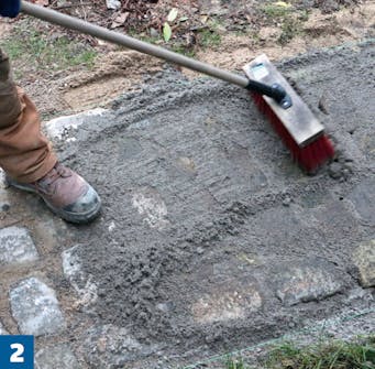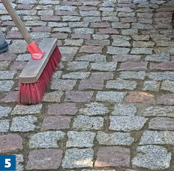 Stenmelet fejes grundigt ned i fugerne. Fej gentagne gange på kryds og tværs. Brostenenes forskellige størrelser og ulige kanter gør, at det kræver lidt ekstra at få det skubbet godt ned.
