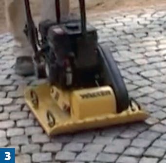 Brostenene stampes med en pladevibrator med vulkolanplade. Pladen beskytter brostenene, så de ikke revner. Vibrationen giver fliserne en ensartet højde, presser afretningsgrus op og komprimerer fugen.