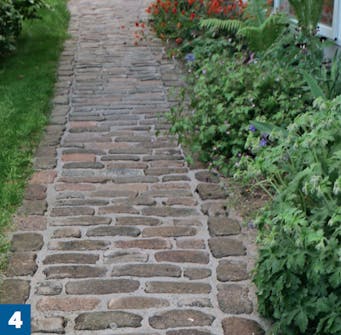 Her bliver kantstenenes overkant lagt højere end brostenenes. Det er for at danne en indramning og samtidig holde den tilstødende jord fra at glide ud over. Men du kan også sagtens lade kanten flugte med den øvrige belægning.