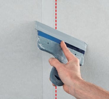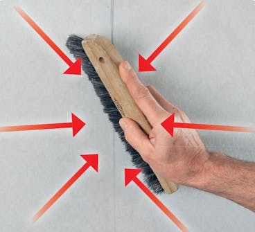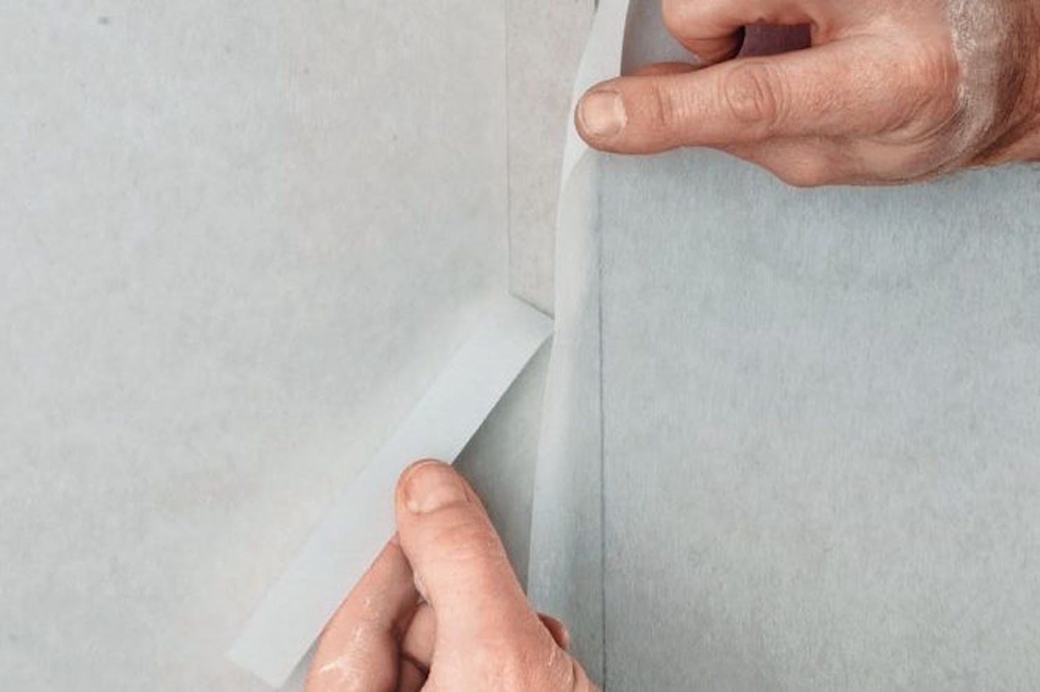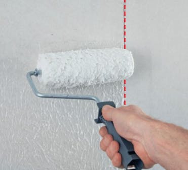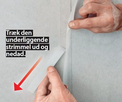 Lim i et jævnt lag hen til stregen. Sørg for, at der er lim over hele fladen. Det er lettest at komme limen på fladerne med en rulle. Kom kun lim på til en bane ad gangen, så limen ikke tørrer.