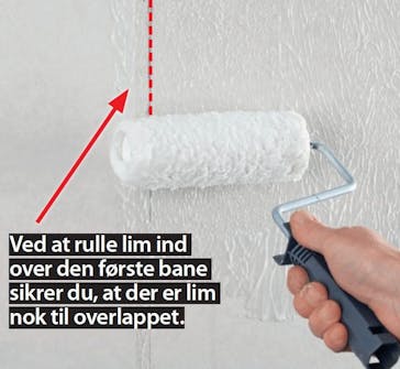 Smør limen til den næste bane ind over kanten på den første. Når du ruller lim på til næste bane, starter du 2 cm inde over den foregående bane og en smule hen over den næste streg.