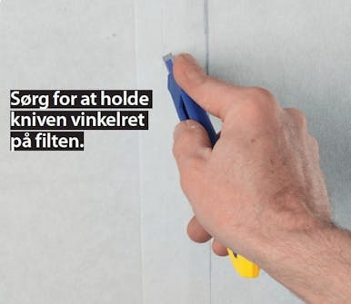 Skær igennem overlægget med en hobbykniv. Med et friskt blad i hobbykniven skæres begge lag filt med et enkelt gennemgående snit midt i overlægget uden at løfte kniven undervejs.