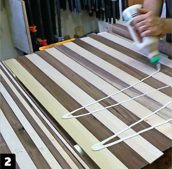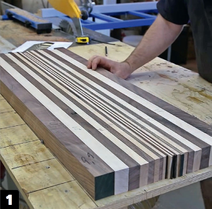 Nu er alt træ skåret til, og vi står med 42 træstave - 21 i ahorn og 21 i valnød i forskellige tykkelser. De skal nu limes sammen til to plader i et bestemt skifte, som du kan se på tegningerne på foregående side.