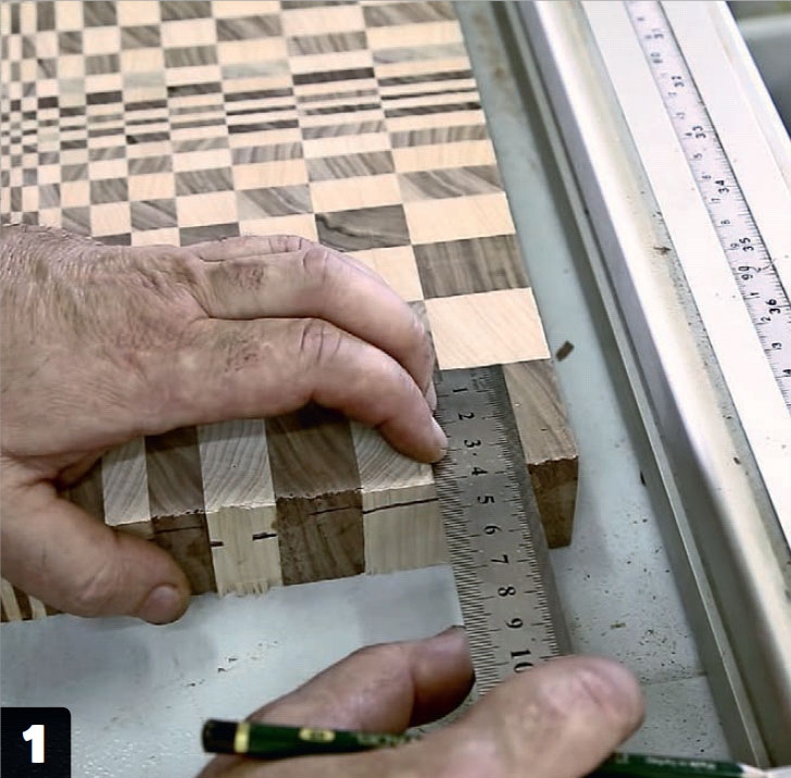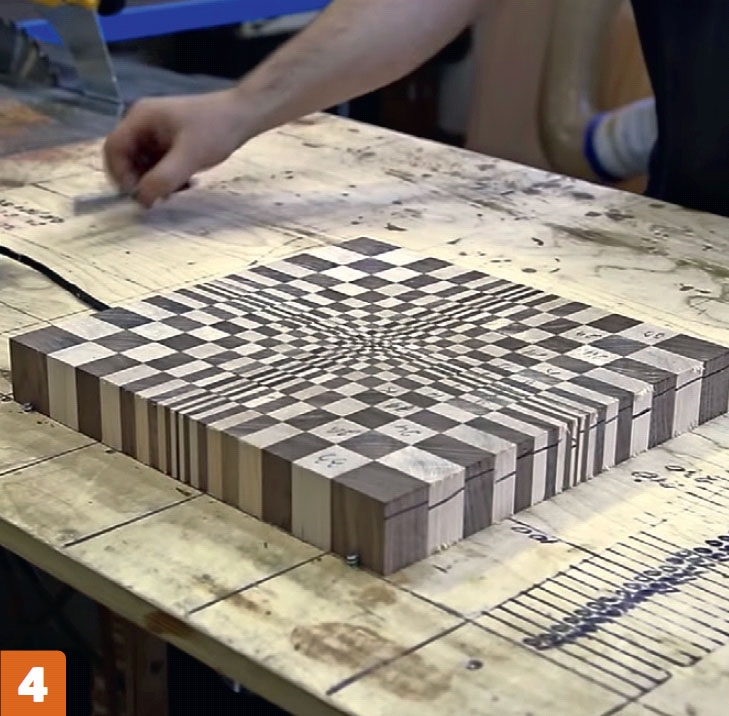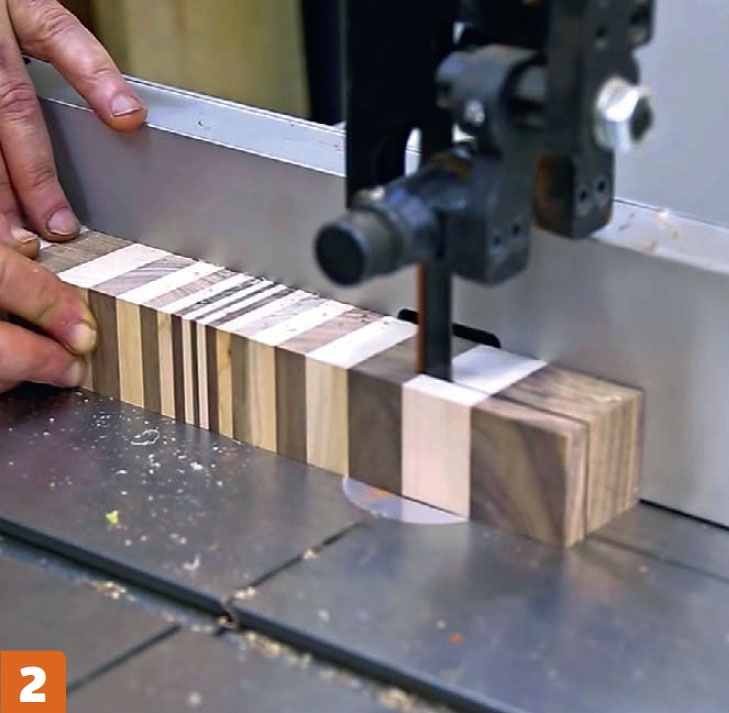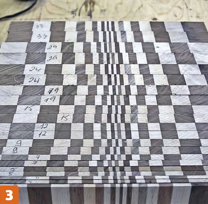 Limen i de to plader er hærdet, og nu skal de skæres til 21 stave i forskellige tykkelser. Vores endelige skærebræt skal have valnød i midten, og derfor skal vi bruge 11 stave af plade 2 og 10 af plade 1. Stavene flettes så sammen til det, der bliver det endelige mønster. Du skal lægge stavene i den rette ræk-kefølge, ellers ryger 3D-mønsteret.