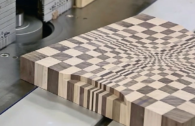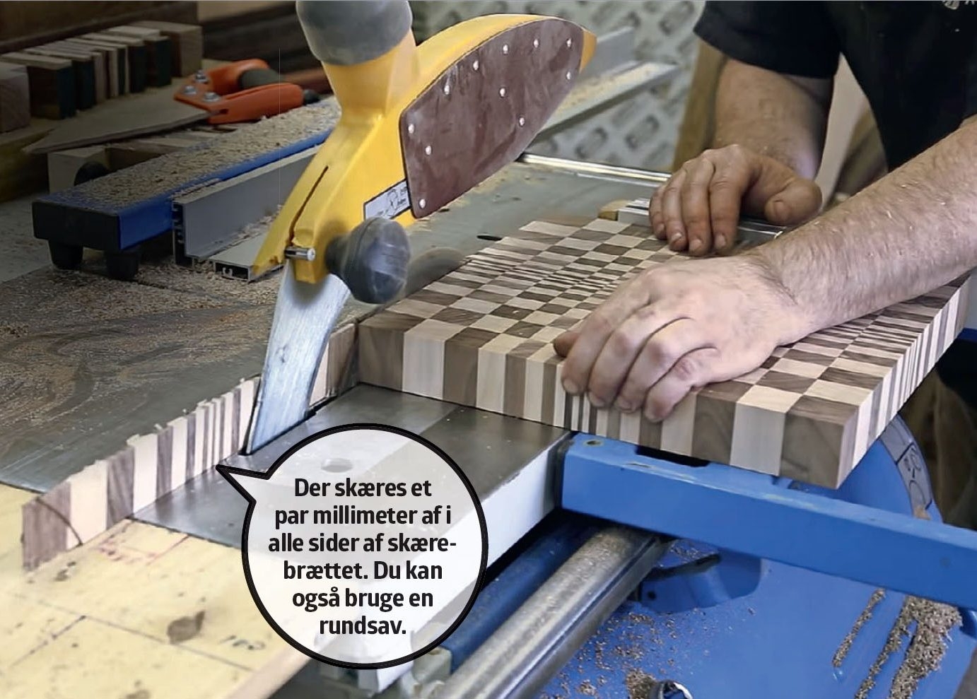 Overskydende træ skæres væk. Vi bruger igen vores bordrundsav og rensaver alle fire sider af skærebrættet, så de fremstår helt rene.