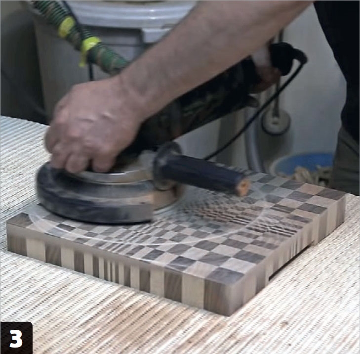 Bagefter skal brættet slibes helt glat med korn 120, og hjørnerne skal også rundes. Det kan enten gøres med slibepapir eller med en overfræser. Til slut skal skærebrættet have et bad i linolie.