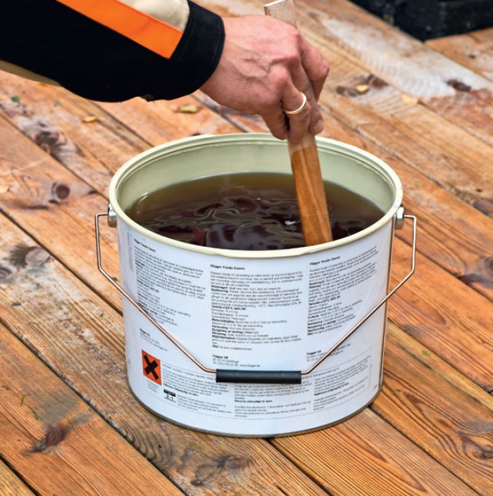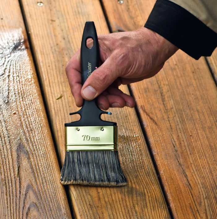 Før terrassen olieres, skal den renses grundigt af. Trærens smøres på med en blød børste et par brædder ad gangen. Efter 10-15 minutter renses det af.