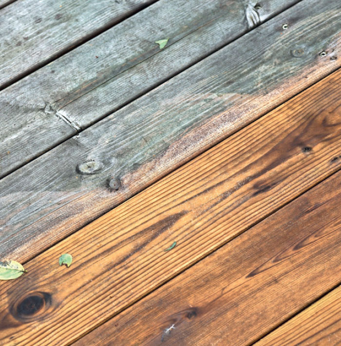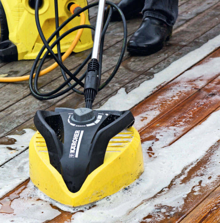 Når rensemidlet har fået lov at virke, fjernes det med vand og en skrubbe eller - endnu bedre - en højtryksrenser, der er påsat en terrasseforsats. Det skåner træets overflade.