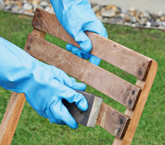 Havemøbler skal først renses grundigt af med trærens, der købes i byggemarkeder og hos farvehandleren. Træet kan også slibes med en fin slibeklods, hvis det er meget medtaget.