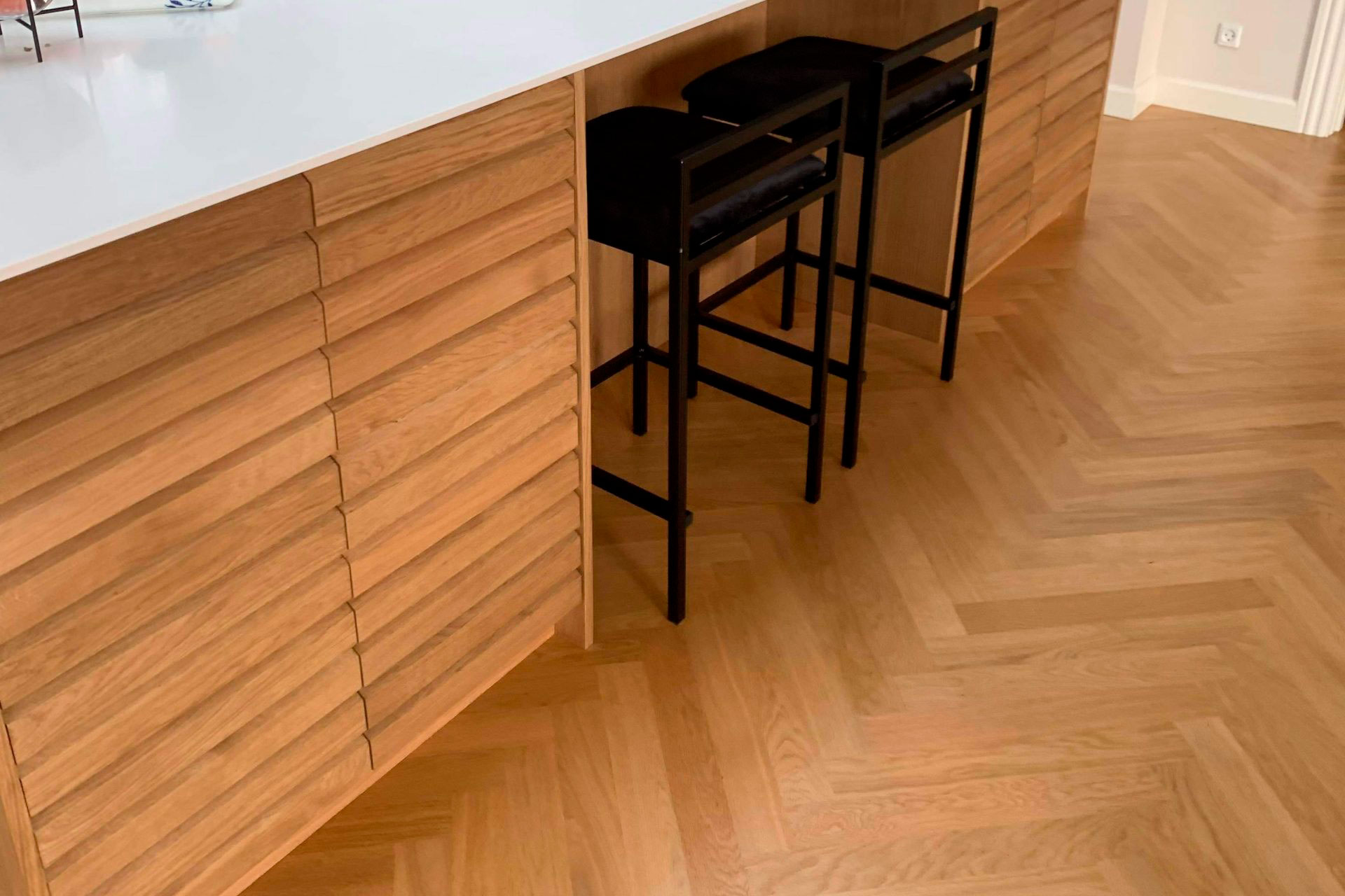 Flotte detaljer og høj præcision giver køkkenet et superflot udseende. Fronterne er tilmeld lavet af egetræsstave, der var i overskud fra sildebensgulvet. Godt tænkt og rigtigt flot udført.