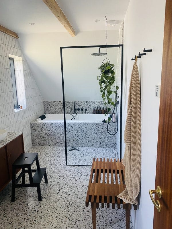 Et alt for lille gæstetoilet og et alt for lille værelse er slået sammen til ét stort, flot og veludført nyt badeværelse.