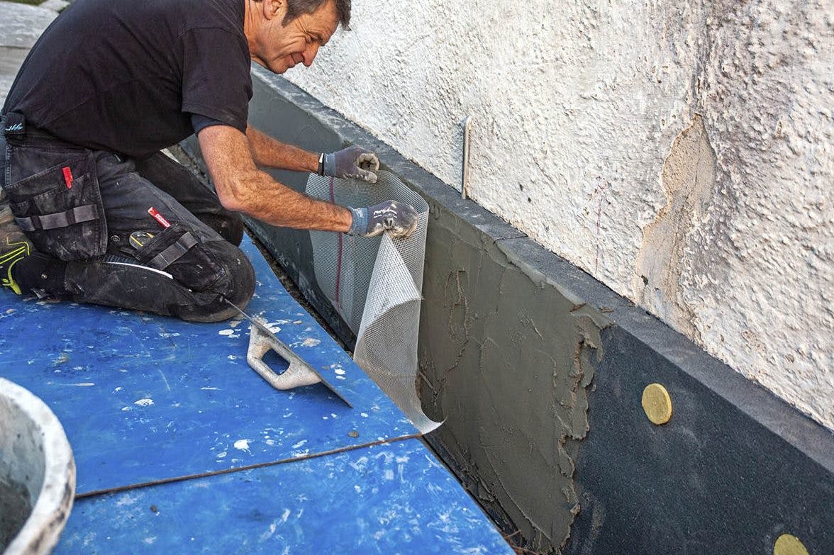 Nettet skal være helt dækket af puds, men må ikke ligge mere end en tredjedel inde i det færdige pudslag. Ligger nettet for dybt, risikerer du, at overfladen revner, og at pudsen løsner sig. Vi slutter af med endnu et tyndt lag sokkelpuds.