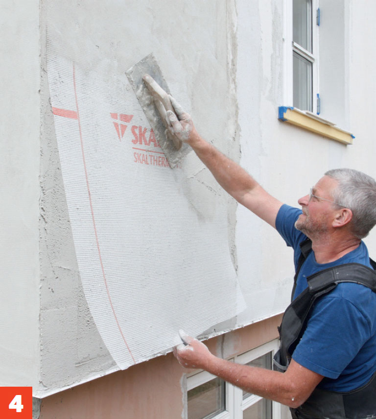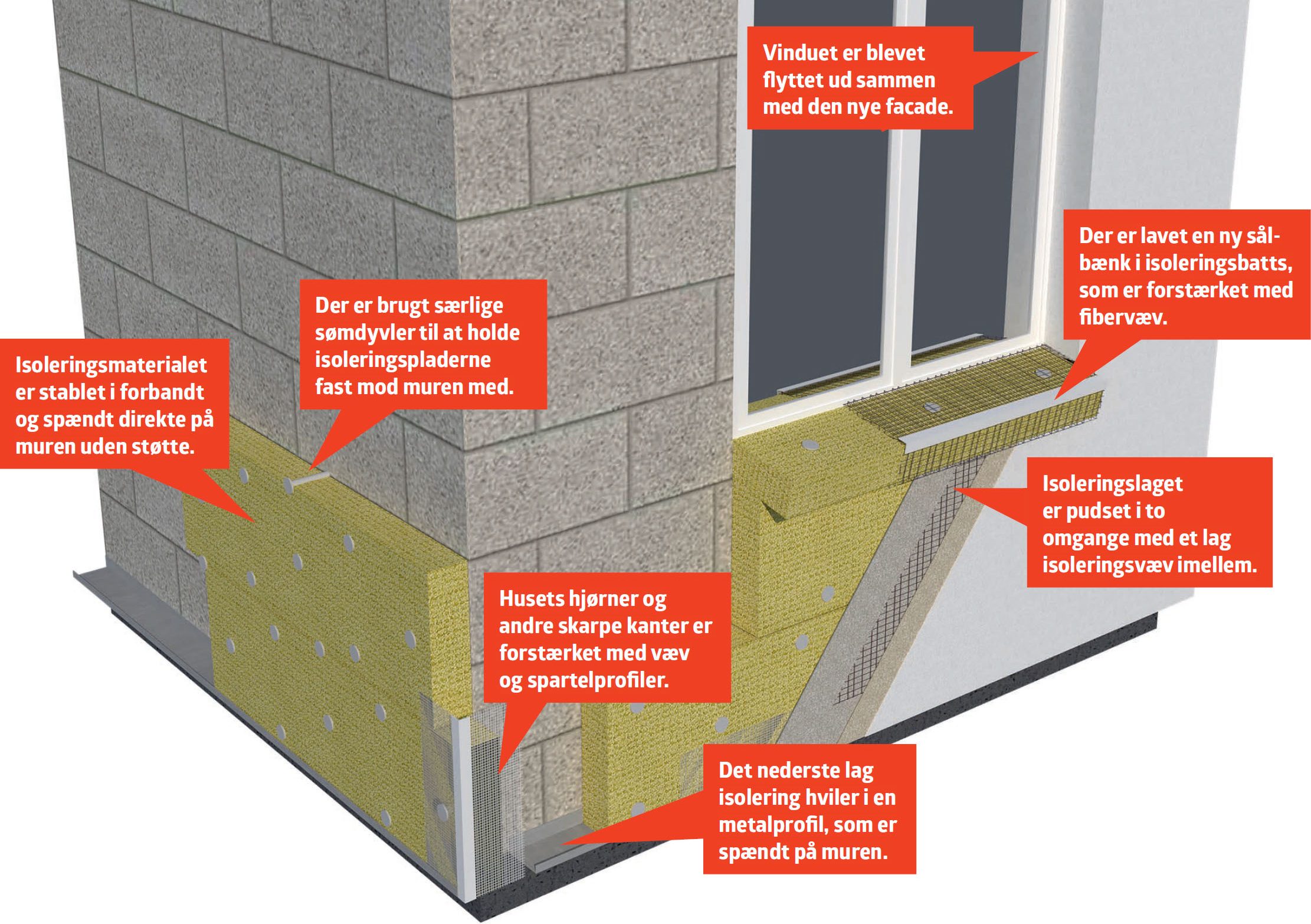 I de fleste tilfælde monteres isoleringsmaterialet direkte på ydermuren og afsluttes med et integreret pudslag.