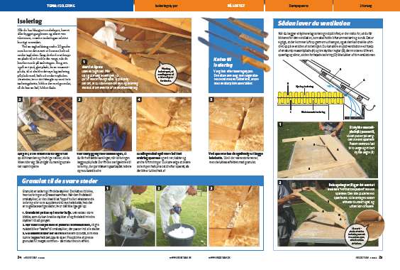 Start i et hjørne ude ved tagfoden. Mål op, og planlæg isoleringen, så du får mindst muligt spild. Typisk betyder det, at du skal vende det nye lag isolering modsat af det øverste af de eksisterende lag.